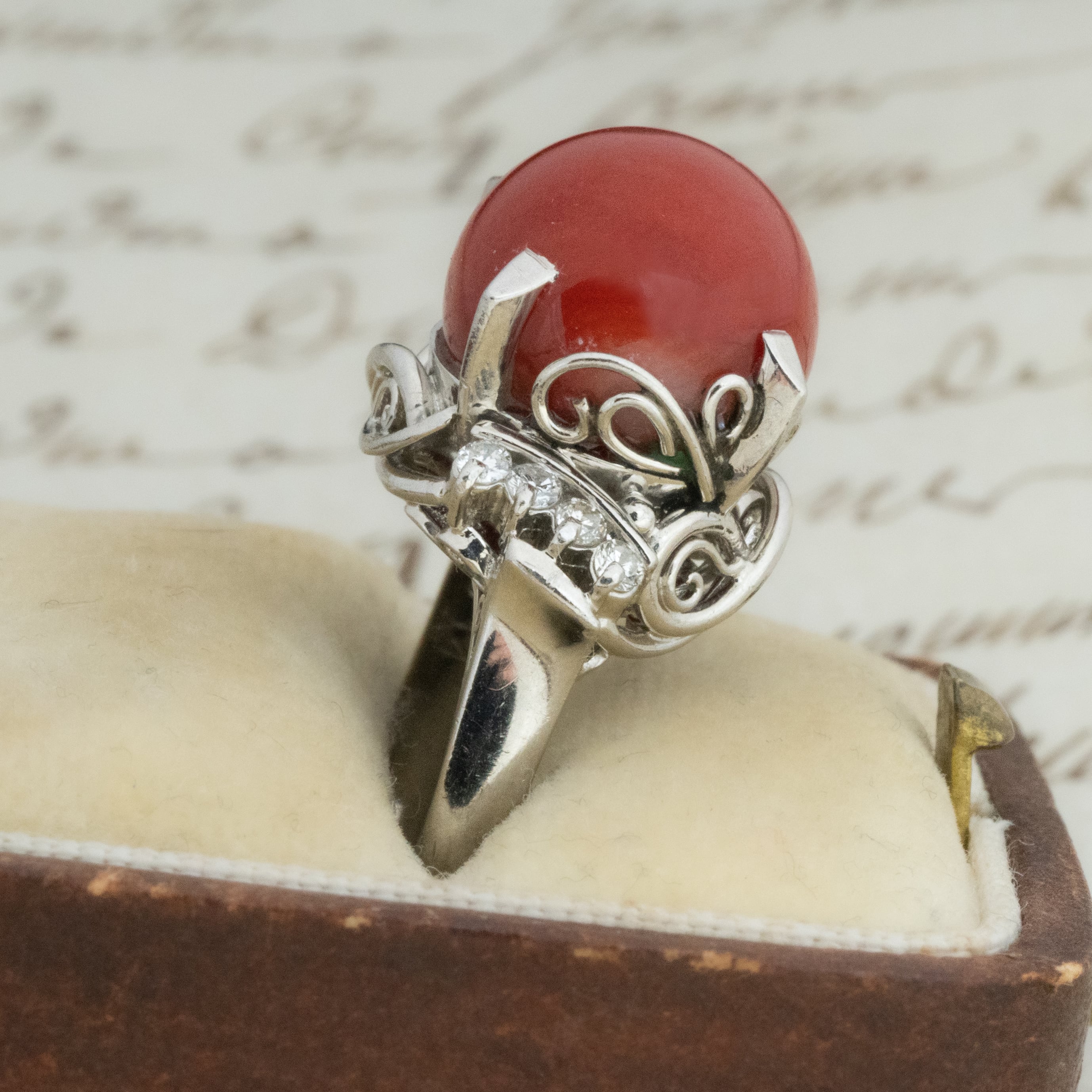 【日本の作品】昭和レトロ デザイン ヴィンテージ リング Pt900 赤珊瑚 ダイヤ アラベスク柄の透かしが素敵 MR00660