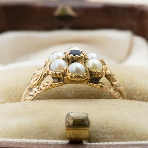 イギリス アンティーク クラスター 小花 デザイン リング K15 パール サファイヤ 〜腕のお花の彫も可愛い〜 DR00671