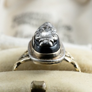 ?中央にはしっかりとしたオニキスが配され、その上には銀で花瓶のような彫刻が施されている大変珍しいデザインです。